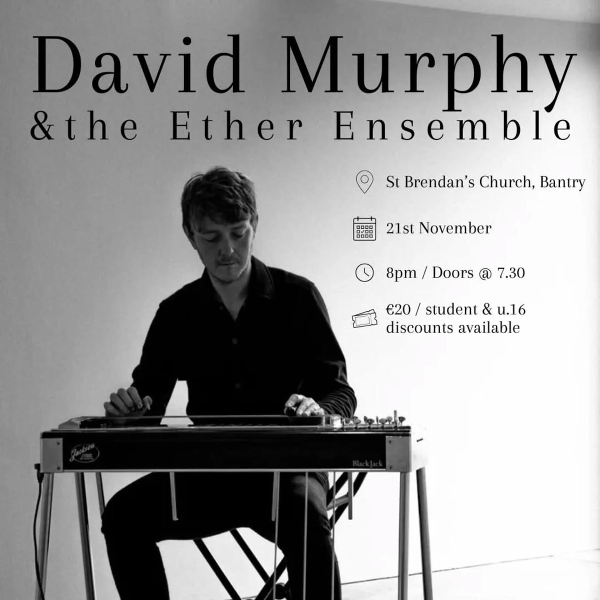 Murphy’s live show presents these ancient Irish harp tunes and historic airs by O’Carolan, O’Riada et al in the 21st century, voiced by the mysterious and emotive sound of the pedal steel guitar and accompanied with his band Ether Ensemble: all-star musicians from across contemporary, modern classical and traditional/folk worlds. Here the pedal steel ably takes its place alongside cello, violin, piano, harp and lush electronic textures and synths. Murphy and his band conjure a palette of sparse, dreamlike, atmospheric soundscapes and stirring, cinematic takes of these culturally significant compositions and melodies from Ireland’s great harpists, composers, and song collectors. Recent appearances include Kilkenny Arts Festival, Electric Picnic, Another Love Story, Cork Opera House, Galway and Doolin Folk Festivals, Celtic Connections (Glasgow), Quiet Lights Festival and national television appearances at TG4’s Fleadh Cheoil and RTE’s Other Voices.
