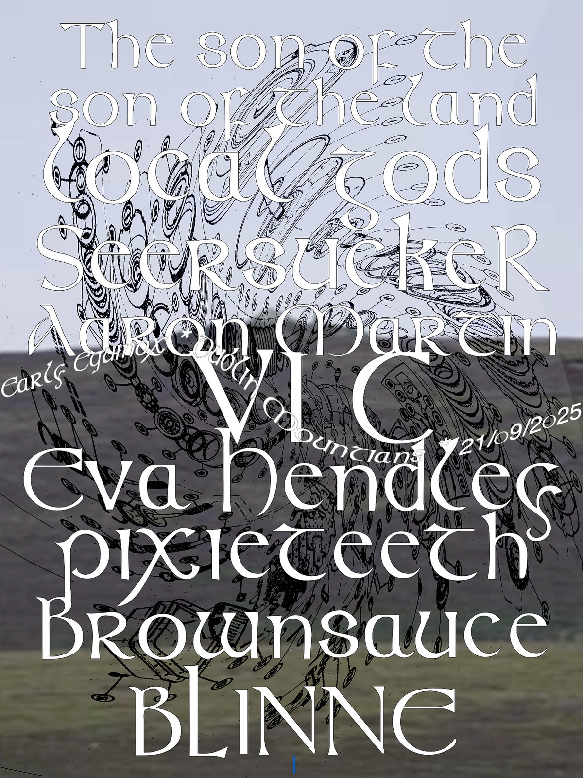 21/o9/2o25 from 12noon: BLINNE (@aisling_or), Brownsauce (@brownsauceee), Local Gods (@dpcallanan/@the_doe_________ ), The son of the son of the land (@wolfejameswolfe, @tom.depaor , @amelia.durac), Aaron Martin (@aaronmartinguitaristmediapage), Eva Hendley (@evahendleyy), VI C (@vice.xd), Seersucker (@quearbag), Pixieteeth (@velvetm0ld_).