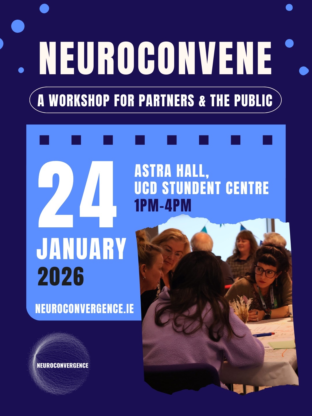 "Join Neuroconvergence for a World Café style workshop-meeting with artistic interludes this January. This is a single event taking place in the Astra Hall, UCD Student Centre on the 24th January 2026. A partners’ meeting that invites partners, sector individuals and the public to contribute to the unity project that is Neuroconvergence."