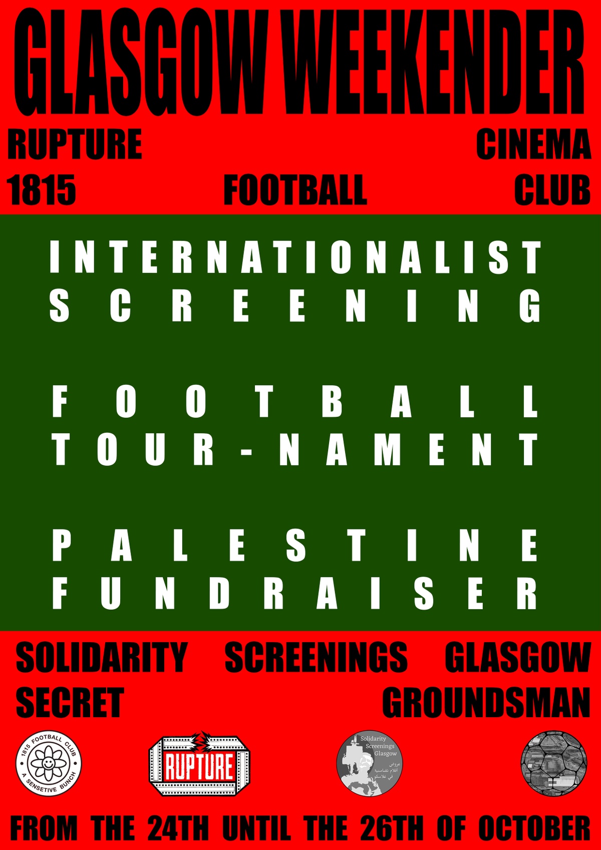 Rupture Cinema and 1815fc are teaming up to collaborate with our dear friends Solidarity Screenings Glasgow and secretgroundsman in Glasgow on the bank holiday weekend (Eire-side) of October, 24th to 26th, to celebrate the historic links between our cities and the shared perspectives of our collectives. The weekend will kick off in a unique location in the east end of Glasgow on Friday 24th of October, with a selection of shorts curated by Rupture Cinema and Solidarity Screenings Glasgow exploring the struggle of oppressed nations against imperialism, with particular attention paid to Ireland, Palestine and internationalism. The screening will feature food, discussion, zines and pamphlets - an all round three dimensional display of the educational and community creating potential of cinema. The next day on Saturday the 25th of October, events will pick back where they left off in the afternoon as 1815fc and secretgroundsman take all comers on a roaming football tour-nament, where a series of matches will take place across Glasgow’s public pitches, with music and agitprop pumping as we move and explore the city through the beautiful game. Concurrent with the events throughout the weekend will be fundraising to gather funds for organisations in Palestine, or those working with Palestinians. In the midst of colonial onslaught and genocide, it is integral we use our mutual aid networks to contribute all as much as we can to those in need. We will announce the specific organisations closer to the time. Specifics of the cinema and football events, of venues, location, time etc will be also later on in October, but for now: book your flights, get your days off and get ready for a weekend of solidarity between two legendary cities, Dublin and Glasgow, as we unite to show how football and cinema can bring people together.