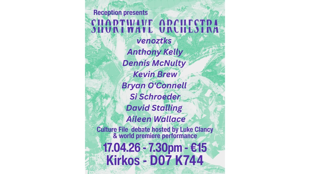 The creation of Mike Harding aka venozkts (Tapeworm), the Shortwave Orchestra performance will take place in three parts. For each part, Mike will be joined by an ensemble of Irish musicians...Anthony Kelly, David Stalling and Bryan O'Connell, then Si Schroeder and Kevin Brew, and lastly Aileen Wallace and Dennis McNulty. Prior to the performance, Luke Clancy will host a Culture File Debate with performers.