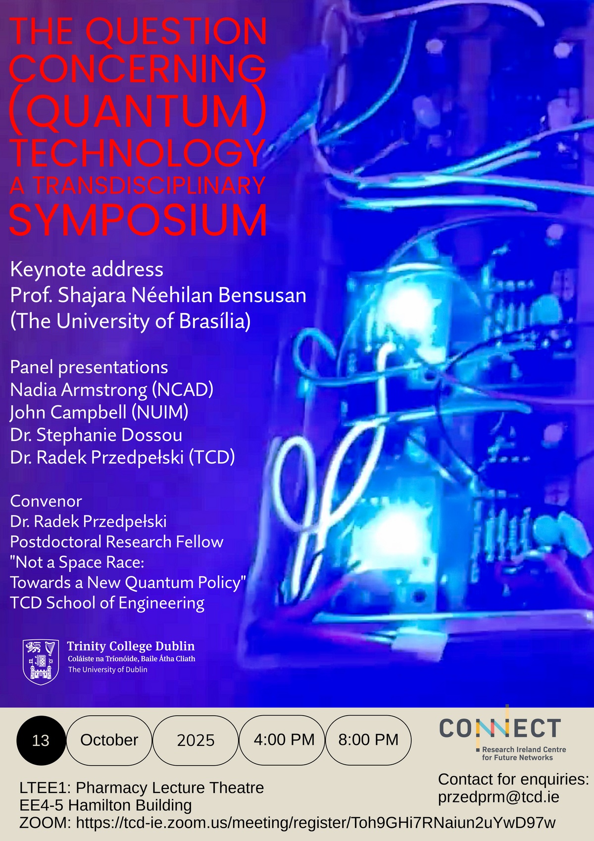 This transdisciplinary symposium (science, philosophy, art, society) will interrogate policies, discourses, models and imaginaries relating to quantum computing and its associated infrastructural and material ecosystems. True to the transdisciplinary approach, we focus not only on the scientific foundations, or technical considerations of quantum technologies alongside their practical, infrastructural aspects but also on their critical and creative aspects. In this way, we foreground the importance of imagination and artistic creativity as a source of speculative problem-solving approaches. The symposium will comprise a transdisciplinary panel of short presentations followed by a keynote on the ideas prefiguring quantum mechanics/computing in philosophy by philosopher Prof. Shajara Néehilan Bensusan (The University of Brasília). Panellists will include physicist and electrical engineer John Campbell (NUIM); visual artist Nadia Amstrong (NCAD); Quantum AI and Finance Art scholar Dr. Stephanie Dossou; as well as digital artist and critical media scholar Dr. Radek Przedpełski (TCD).
